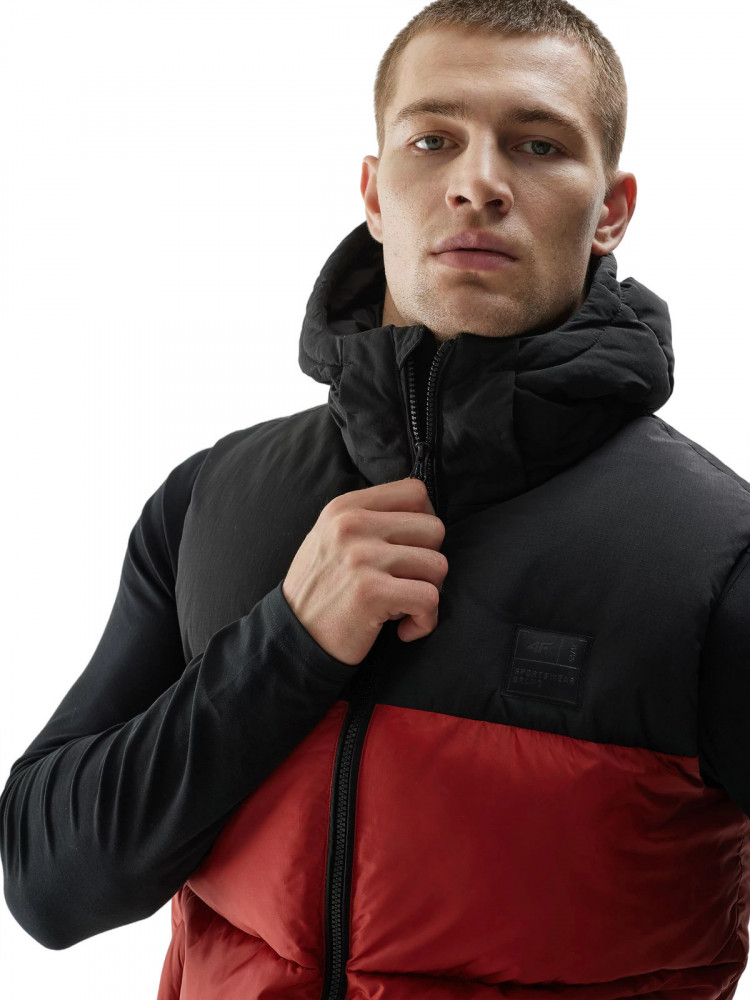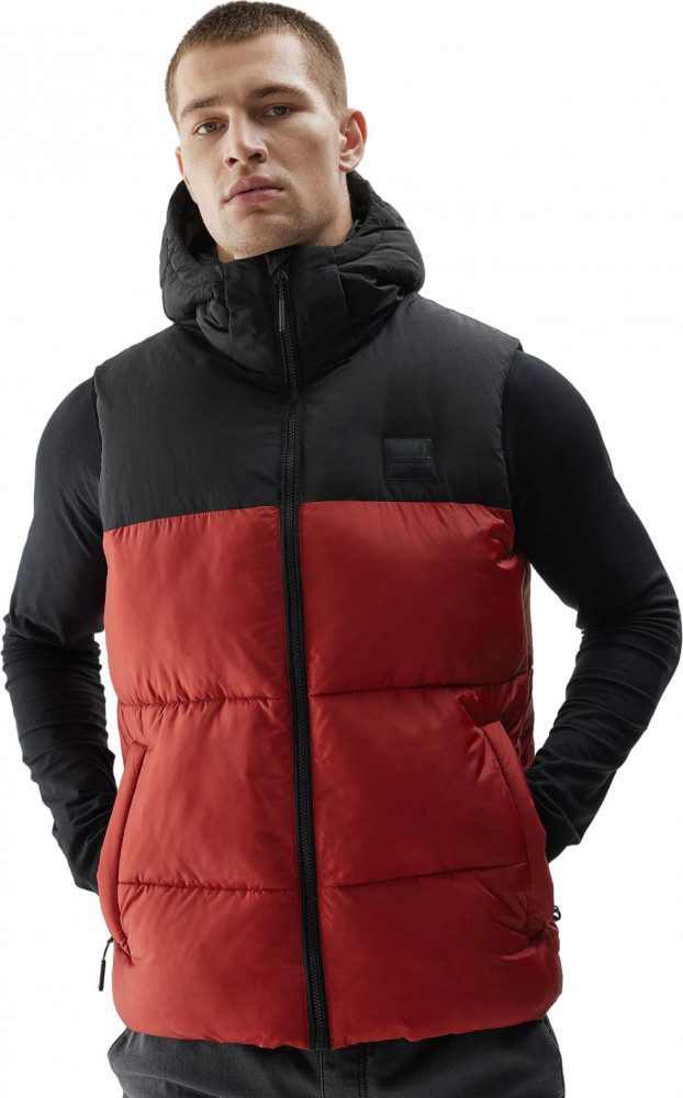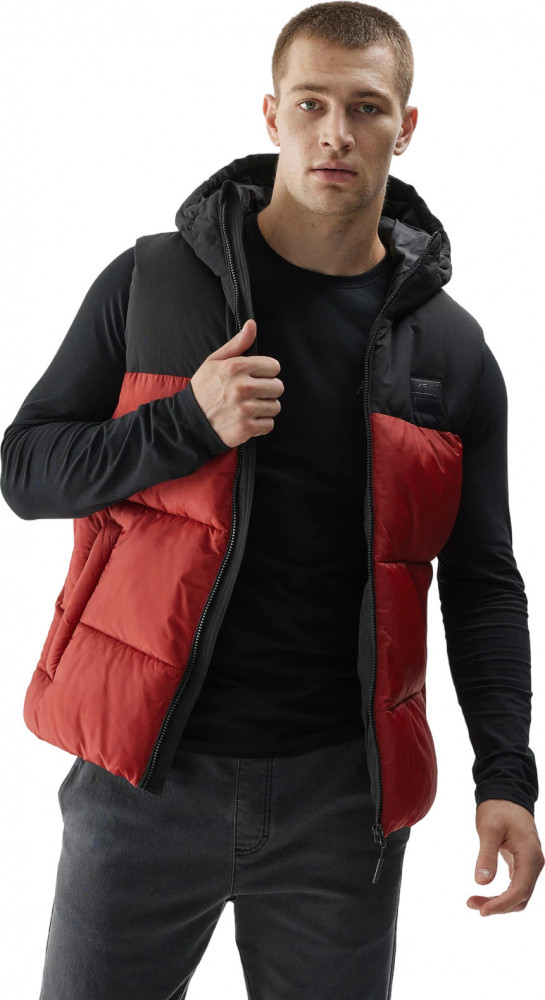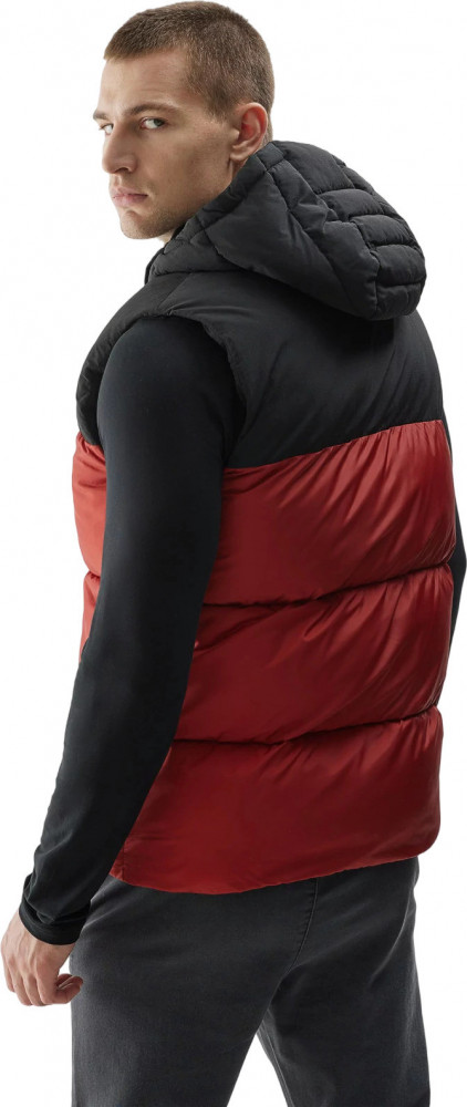 Жилет также имеет удобный капюшон с высоким воротником-стойкой для защиты от ветра и карманы для мелочей.