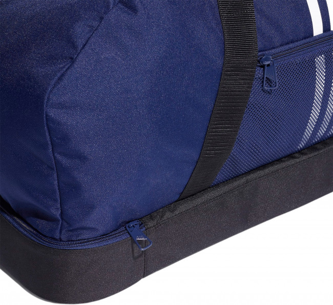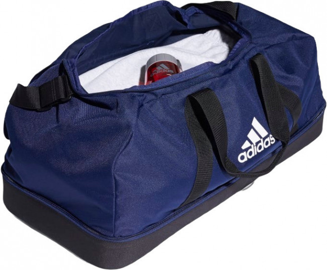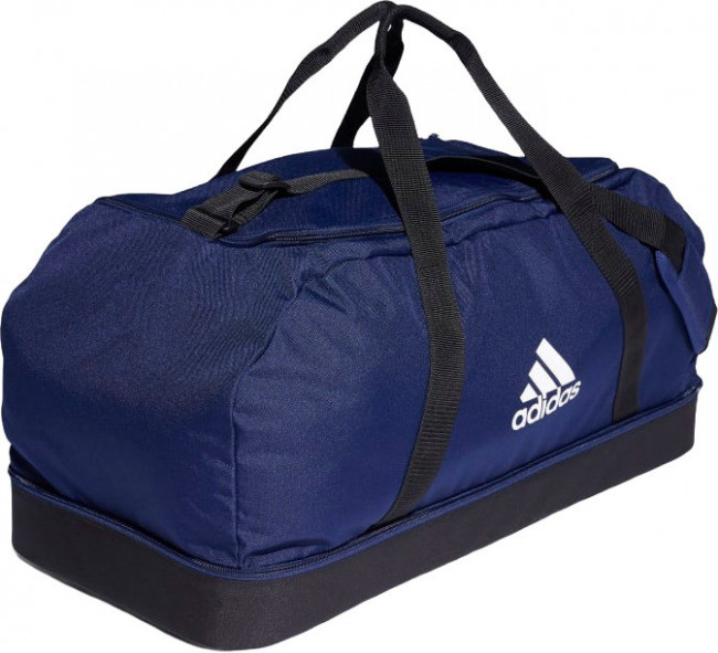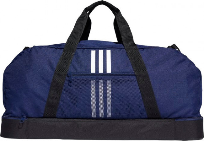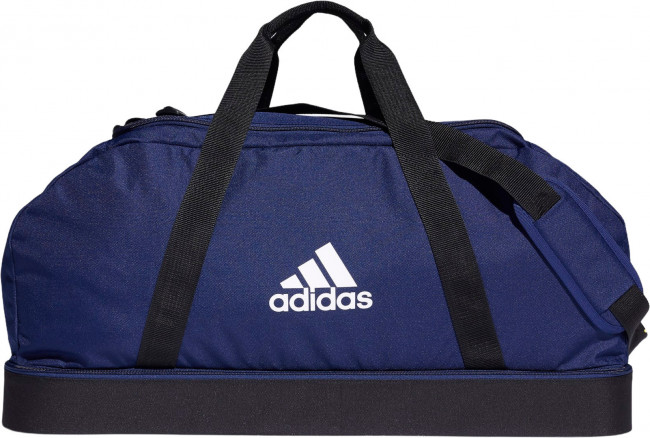 Спортивная сумка Tiro Primegreen Bottom Large. Если твоя сумка переживет футбольную раздевалку, она переживет что угодно. Эта прочная модель выполнена из переработанных материалов в рамках обязательств adidas по сокращению пластиковых отходов. Благодаря множеству отделений ты можешь разделить экипировку. Шипы на основании позволяют сохранить сумку чистой, даже если приходится ставить ее на не самый чистый пол. В состав этой модели входит материал Primegreen, созданный из переработанных волокон.