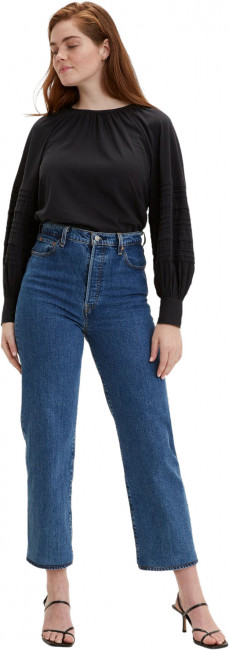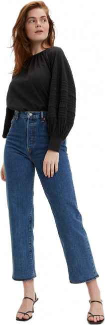 Джинсы прямого кроя с высокой посадкой для подчеркивания талии. Ширинка на пуговицах. Легендарная кожаная нашивка на талии сзади. Длина до щиколотки. Классический стиль с пятью карманами. Фирменный лейбл Levis и дугообразные строчки на задних карманах.