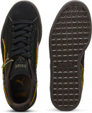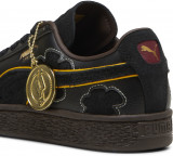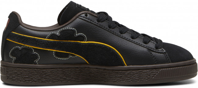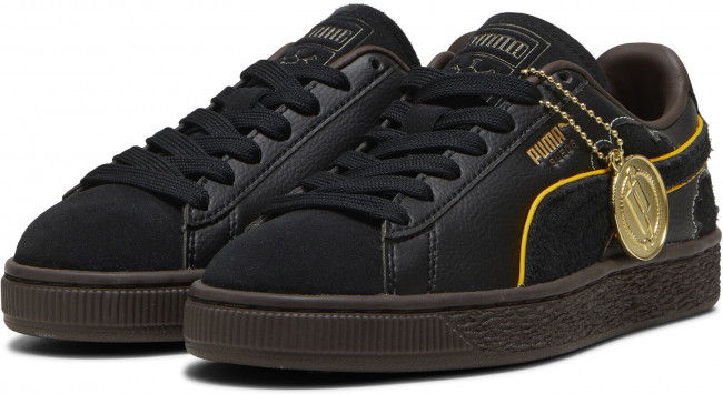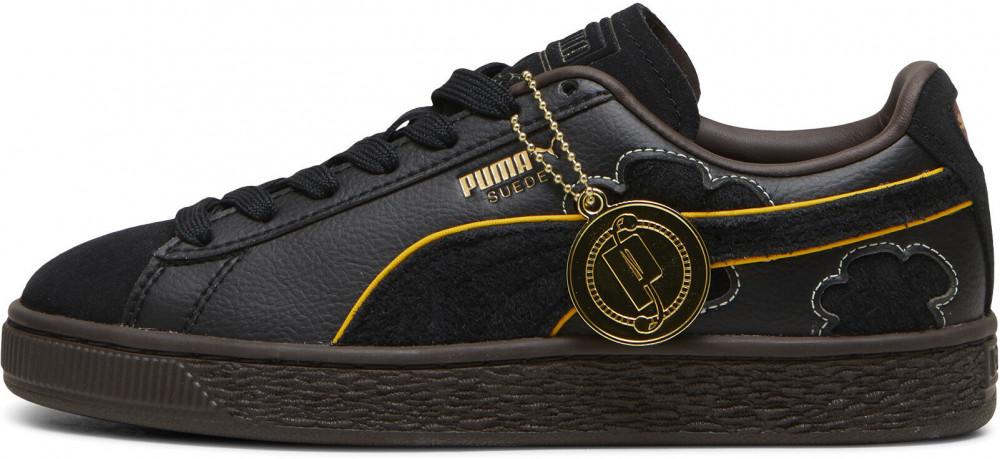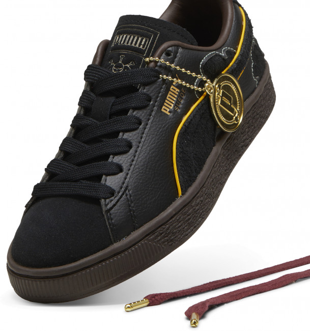 Верх кед выполнен из мягкой меховой замши и натуральной кожи, обеспечивающими долговечность и стильный внешний вид. Золотая металлическая бирка сбоку подчеркивает эксклюзивность коллекции, а уникальные детали, такие как тисненый логотип PUMA Cat на одной пятке и череп на другой, создают атмосферу приключений.