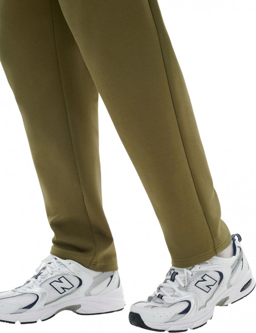 Ткань Interlock, состоящая из 77% хлопока, 16% полиэстера и 7% эластана — плотное полотно двойного переплетения, сохраняющее форму и приятное на ощупь. Прямой слегка широкий силуэт обеспечивает свободу движений и современный внешний вид. Регулировка посадки с помощью наружных круглых шнурков с пластиковыми наконечниками. Объёмный эмбосс-принт справа под карманом выполнен методом термопрессования: выпуклый снаружи и плоский изнутри. Два боковых кармана без молний, оформленные листочками в цвет ткани, удобны для мелочей. Материал сохраняет форму, подчёркивает силуэт и остаётся комфортным при длительной носке.