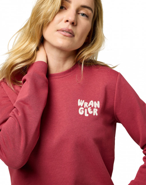 На груди слева расположен небольшой логотип Wrangler, который подчеркивает принадлежность к знаменитому бренду, известному своим качеством и долговечностью. Этот элемент добавляет изюминку и завершенность дизайну, делая свитшот узнаваемым и модным.
